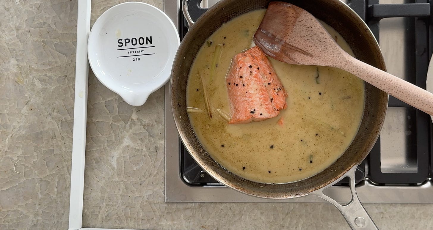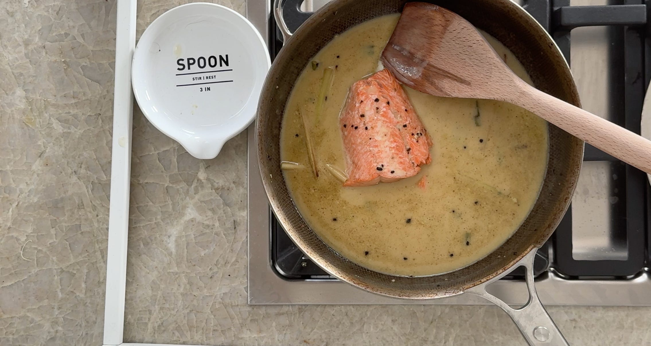 3ļøā£ Poach the salmon: Season salmon with salt and pepper. Nestle fillets into the broth and bring to a gentle simmer. Reduce heat, cover, and cook for 6ā8 minutes or until salmon flakes easily with a fork.